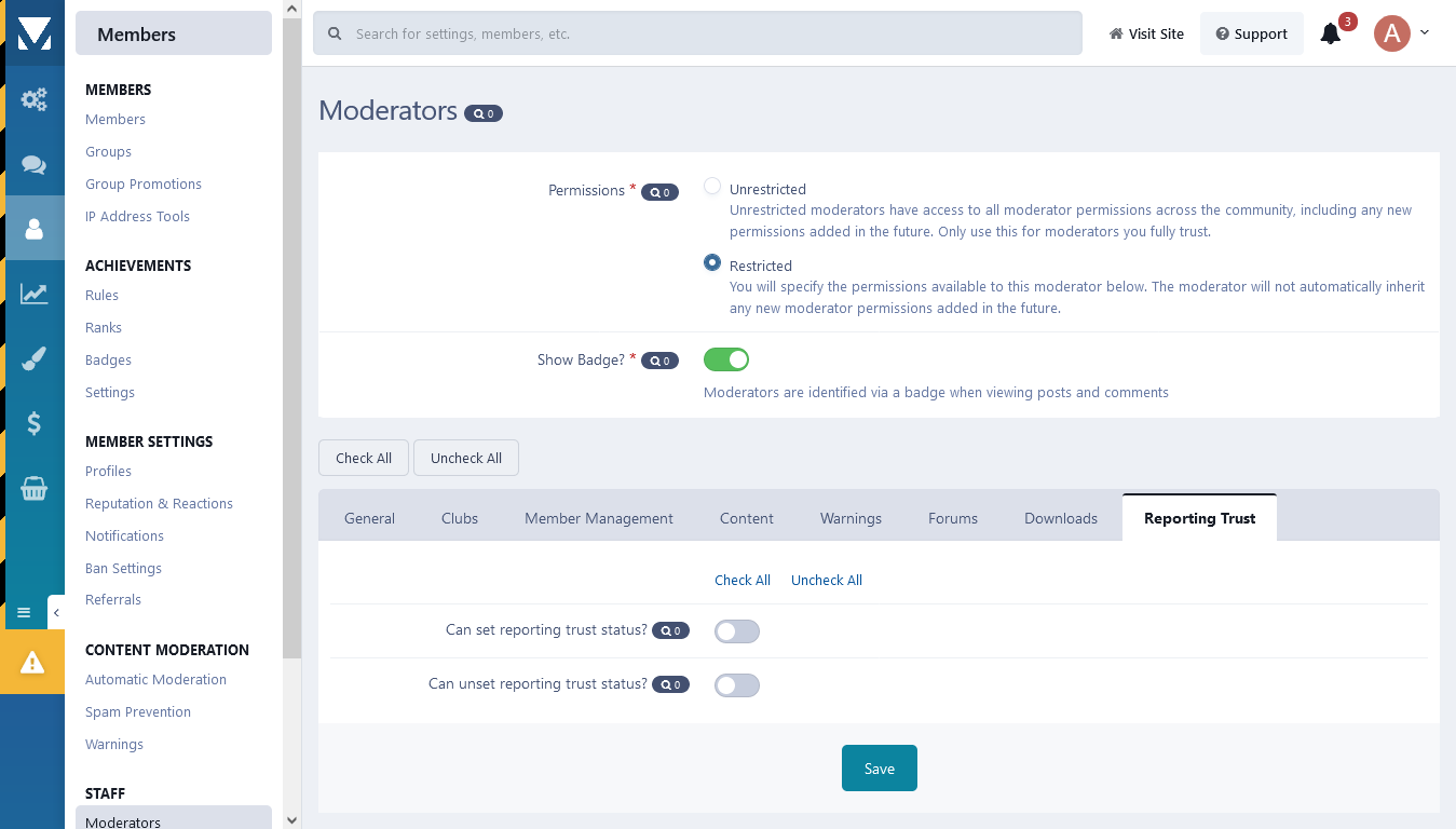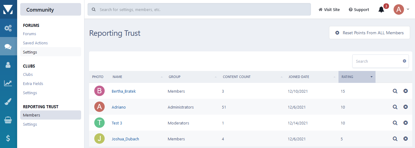Build a trusting relationship with your users by allowing them to earn points by reporting content. These points can be used towards automatic moderation or group promotion so you can change automatically the group of member based on their reliability or even set an automatic moderation based on the rating points.
