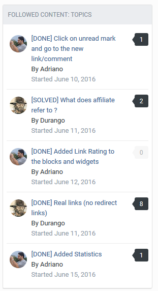 This widget will display followed content from all contents available on your board, like Forums topics, Gallery images, Downloads files, Blog entries, Calendar events and Pages records, order by last post, so you can get fast access to your followed items when they got a new reply/comment. It also will display records from any 3rd party app that meets the requirement for IPS4 Content, such as Tutorials, Videos System, VideoBox, Raffles, Quizzes, Crowdfunding, etc.