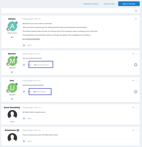 This plugin will add the FOLLOW button in members' posts in the topic view.