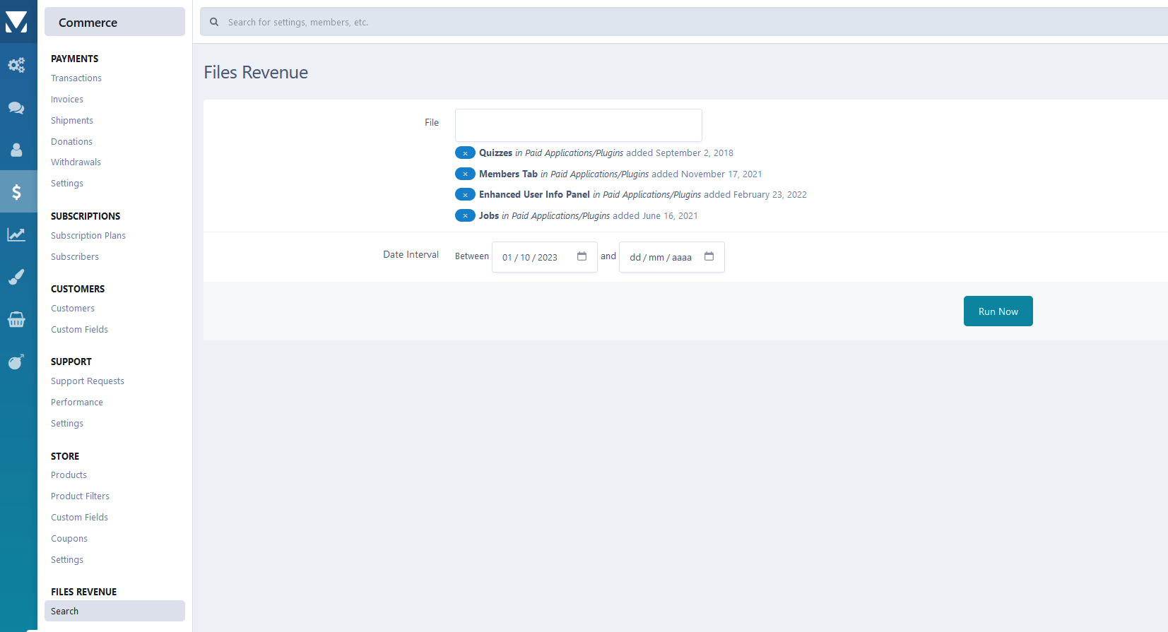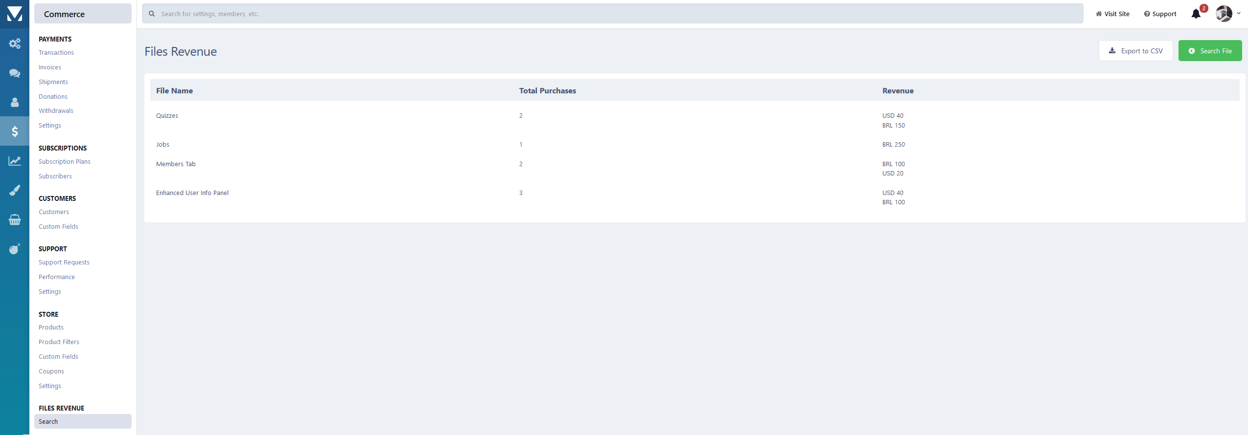 This resource will provide administrators with information about the revenue generated for each file in their installation, broken down by currency. It takes only PURCHASES into account; renewals don't.