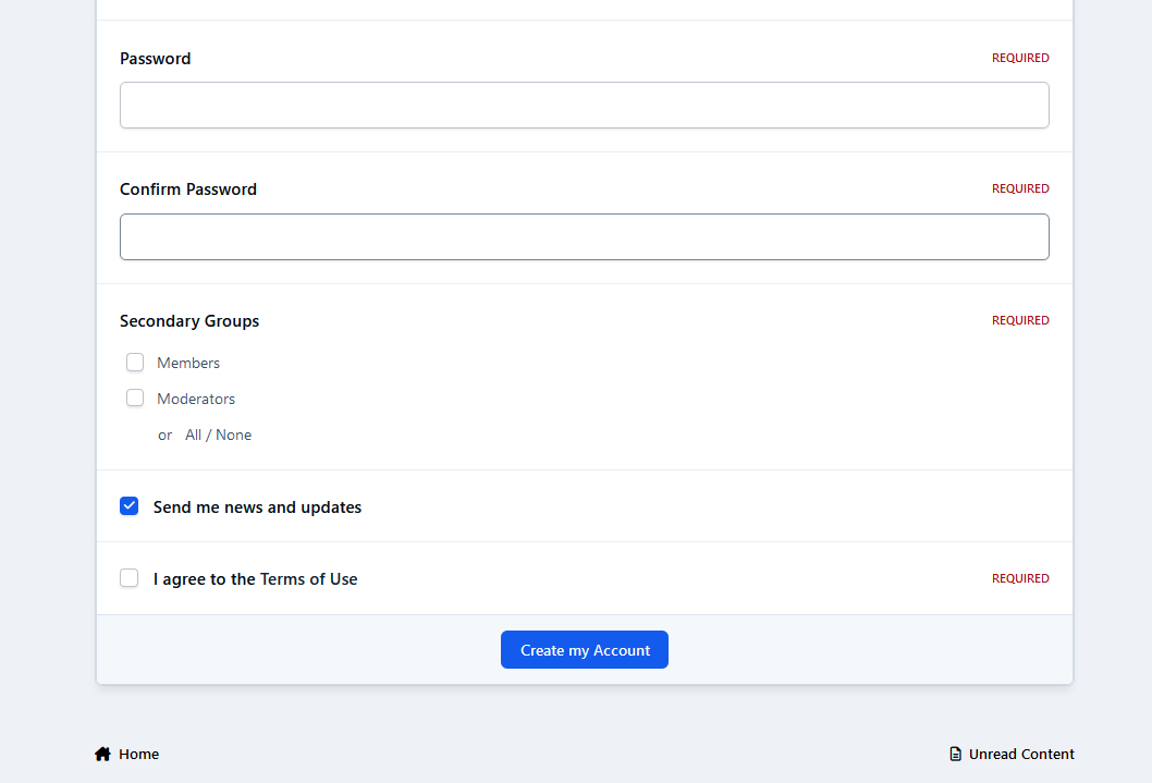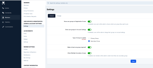 This application will allow users to choose groups in the register form during the registration process, OR on Account Settings if their groups are allowed to. The admin will set up which groups will be available on the registration screen/account settings.