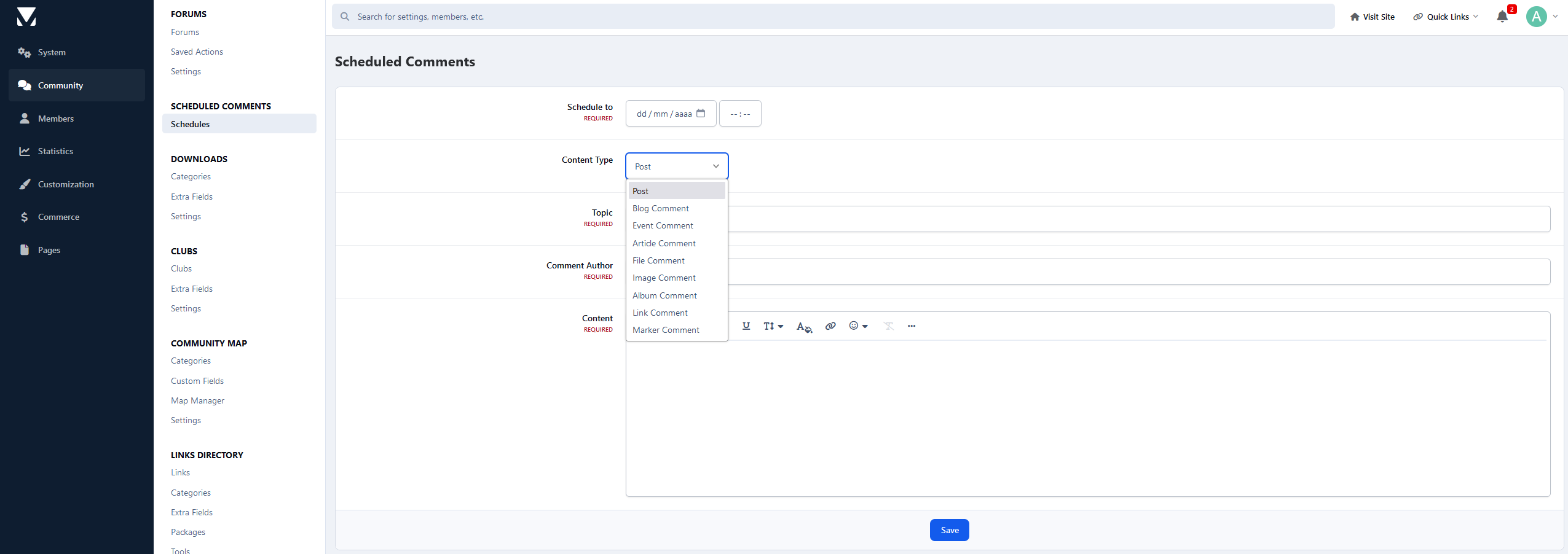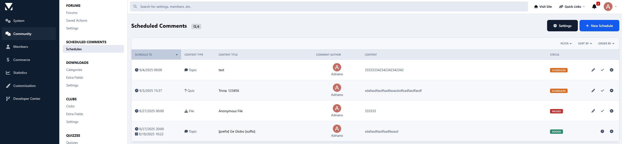 Admin CP & Front End: You can choose the content item, type the comment content, and a date/time to post the comment. You can also change the schedule status to PAUSED, which means it won’t be posted while paused.
