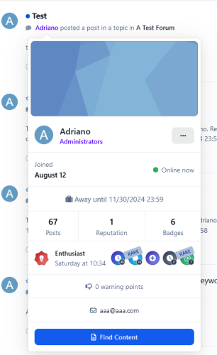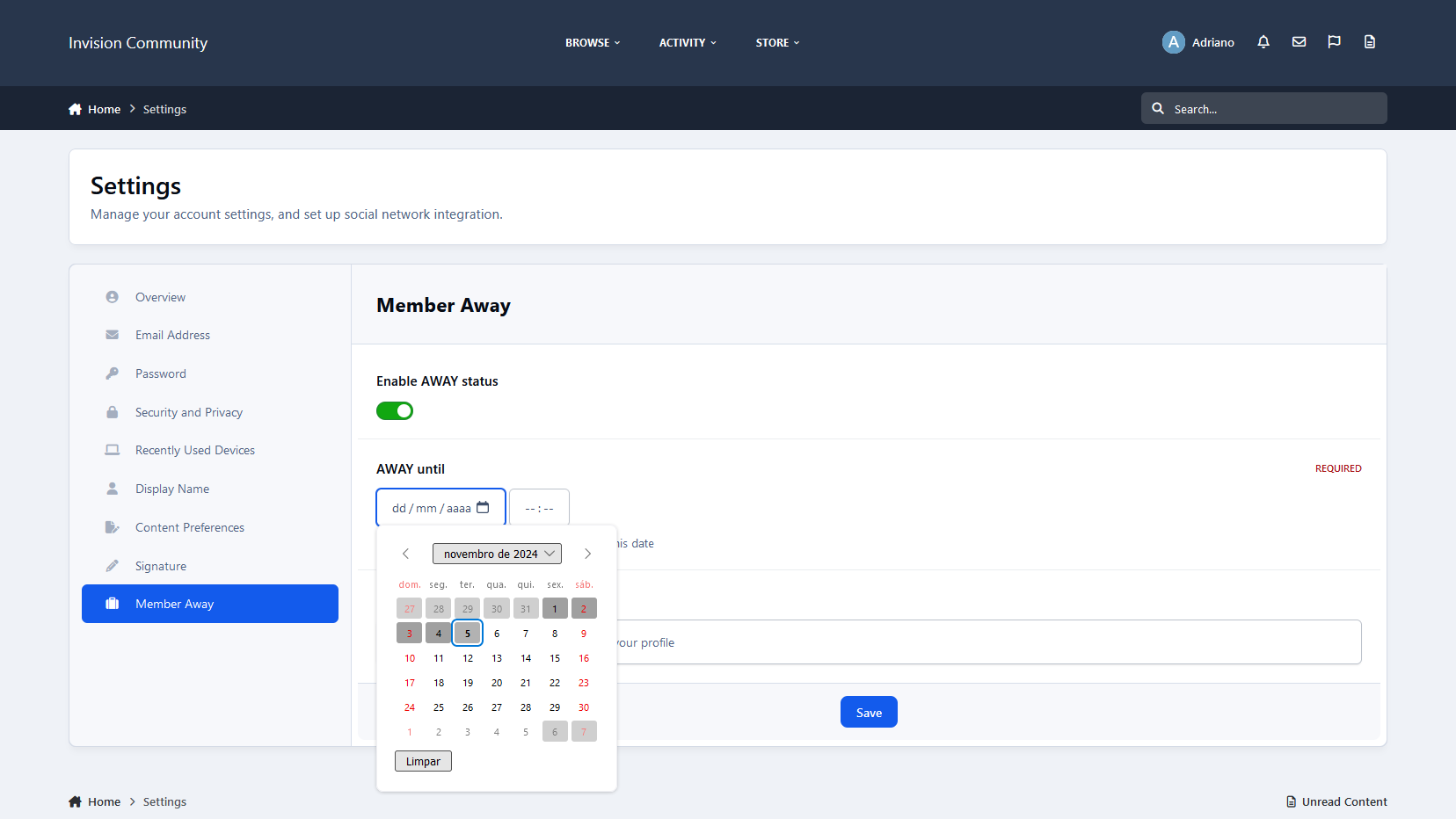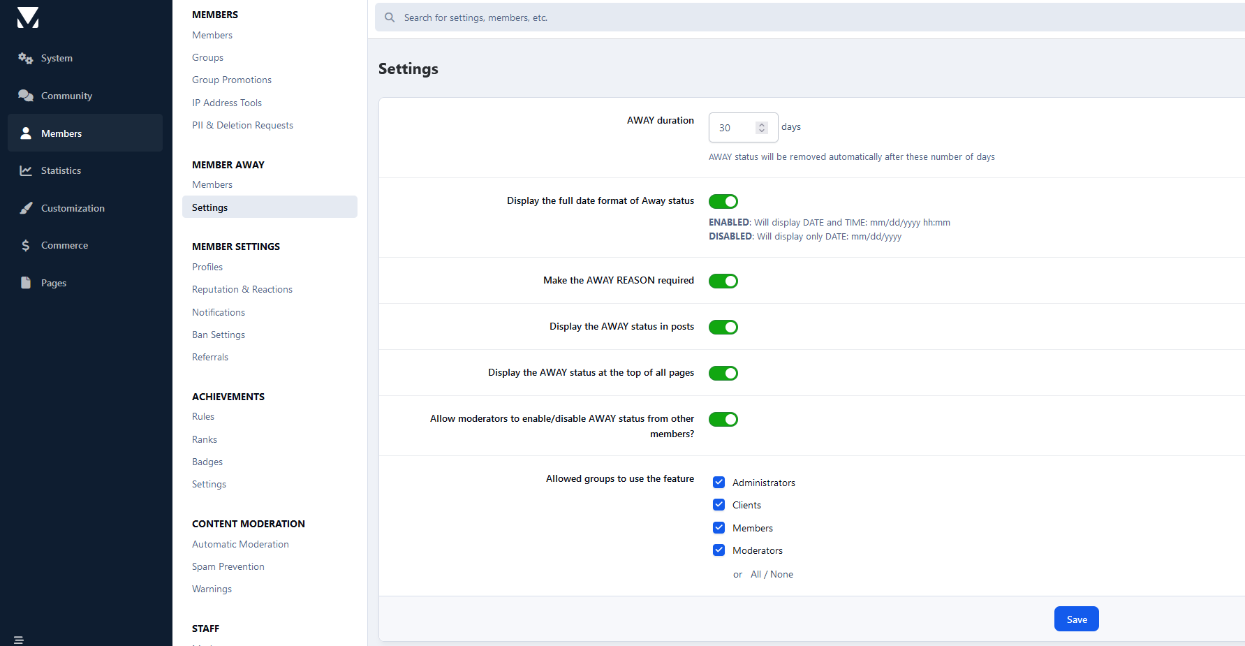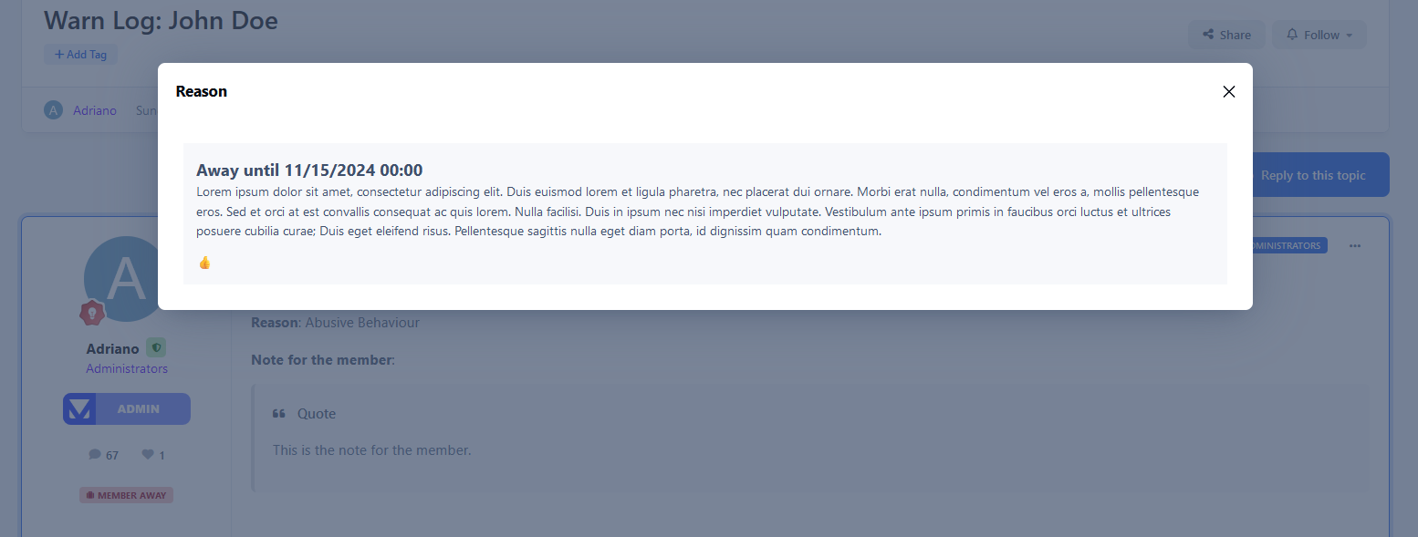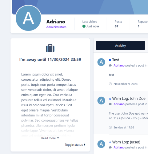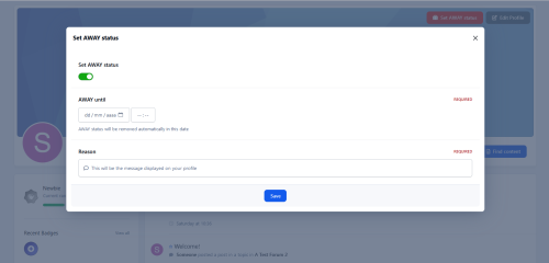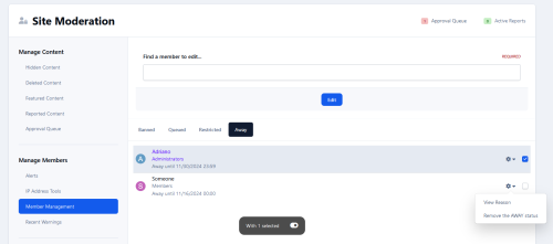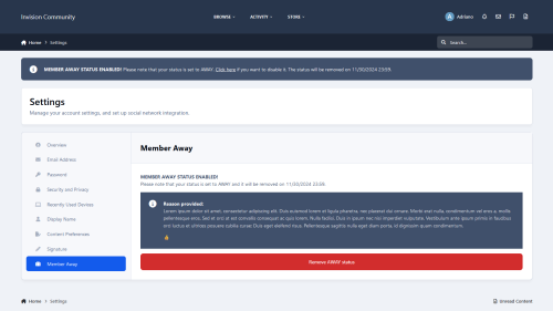 This application will let other users know you are away for a specific reason. Made specifically for moderation purposes, it can be used by any group to inform that you are away for a few days. Moderators with proper permission can set/remove the AWAY status from other users on their profiles or manage statuses on Moderator CP -> Member Management -> Away tab.