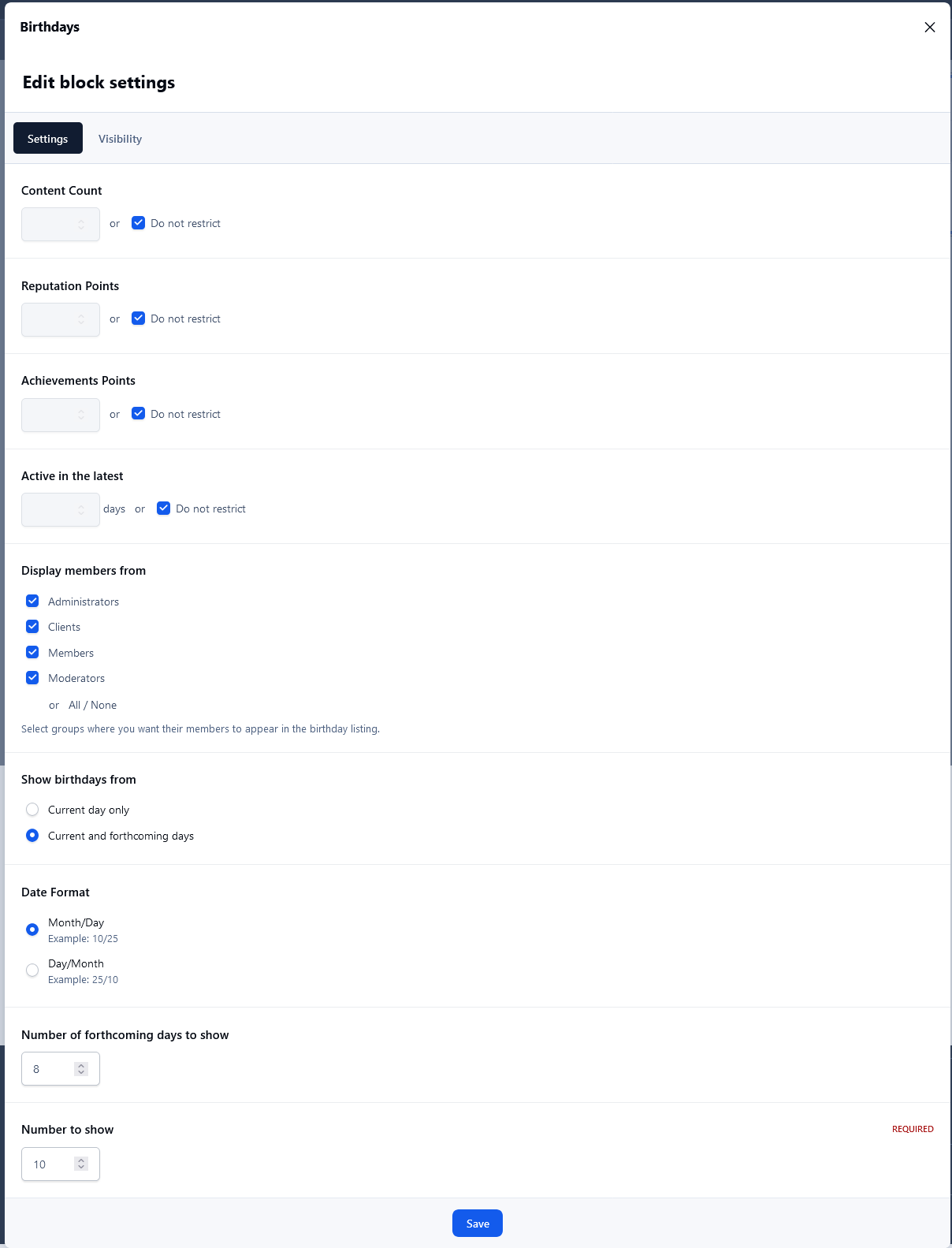 Show birthdays only to admins and the member themselves: will show the widget to admins only.