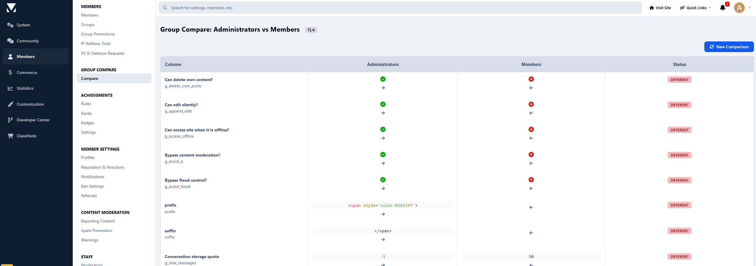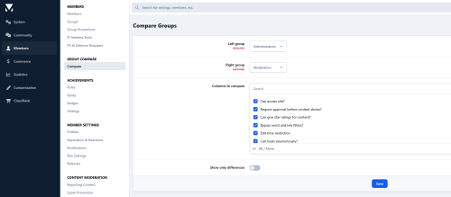 This tool allows administrators to select any two member groups and instantly see their differences side by side. Each permission and setting is stored in the core_groups table is displayed clearly, making it simple to identify where groups differ and how they are configured.