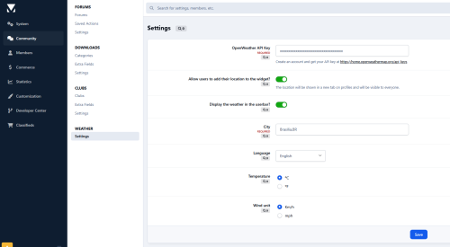 Administrators can configure the default city, language, temperature unit (Celsius or Fahrenheit), and wind speed unit (km/h or mph) directly from the AdminCP, allowing the widget to match the preferences of your community.